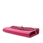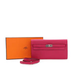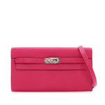 This Kelly To Go crossbody features a Chevre Mysore leather body in Rose Pourpre color, a removable flat leather shoulder strap, a front flap with turn-lock closure, and interior zip and slip pockets.