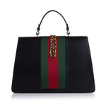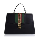Description The Sylvie satchel features a leather body, a web trim, a flat top handle, a detachable flat leather strap, a front flap with buckle accented flip-lock closure, and interior zip and slip pockets.