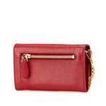 | Description | This card holder on chain features a saffiano leather body, a chain link strap, a front flap with snap button closures, an exterior back zip pocket, and interior slip pockets. |