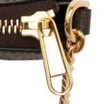 | Description | This baguette bag features a coated canvas body with leather trim, a gold-tone chain strap, and a top zip closure. |